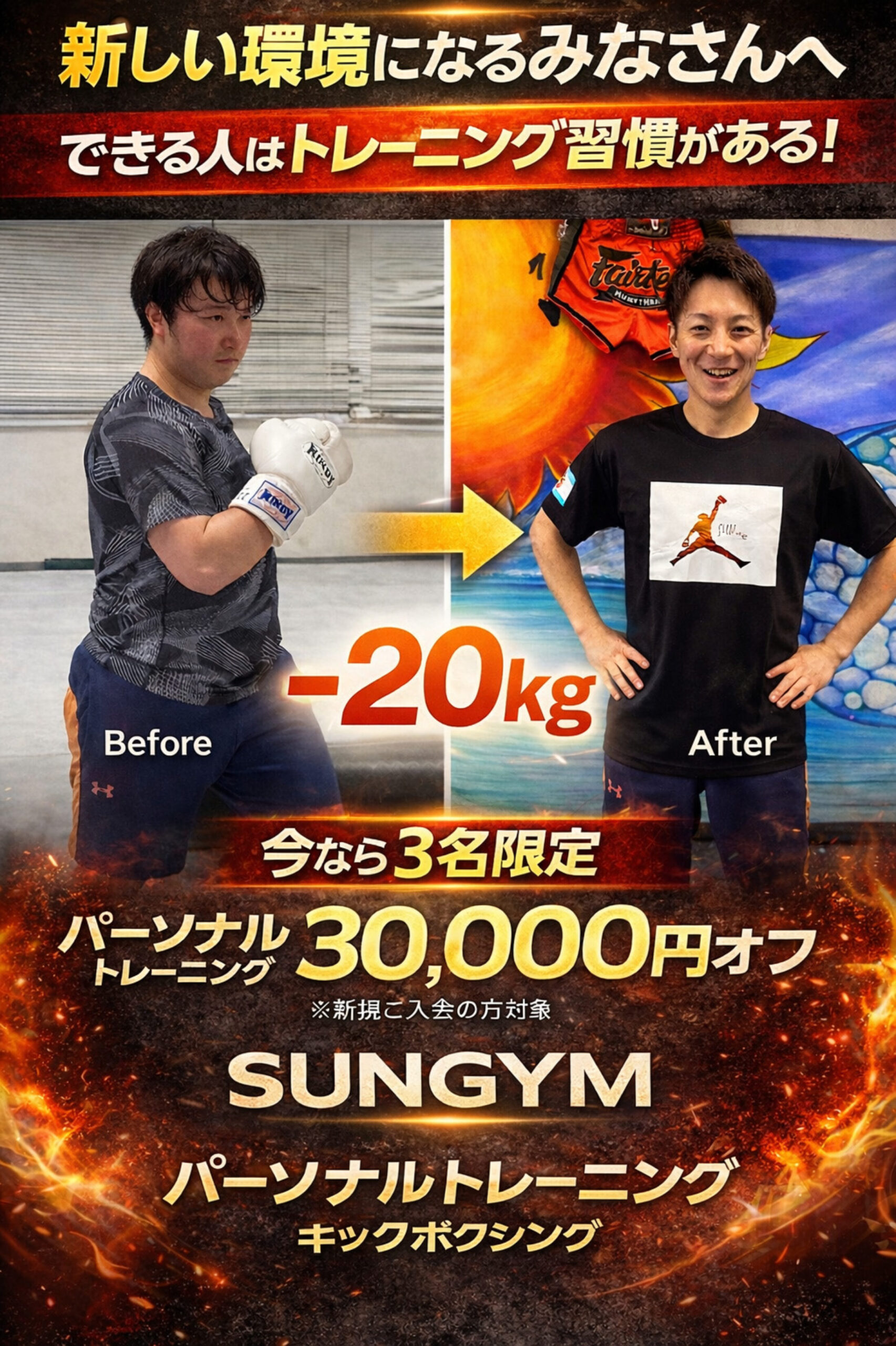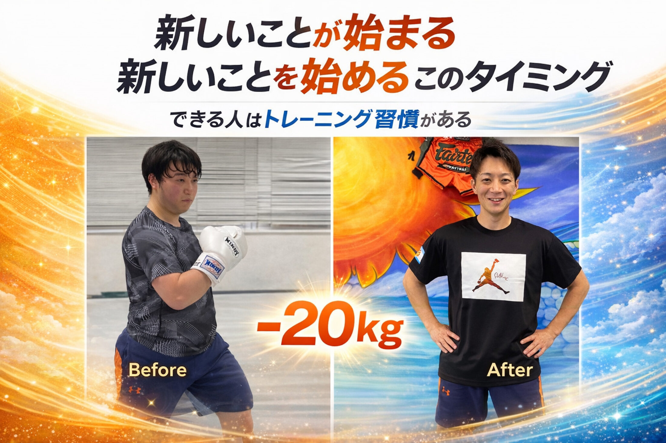 パーソナルボディメイク&クラスキックボクシング SUN GYM 当ジムのコロナウイルス対策について 【それぞれに合ったペース、メニュー、コース】で、パーソナルトレーニング始めてみませんか? ボディメイク希望、運動不足解消の方、女性トレーナーレッスン希望から試合出場の方まで対応⭐︎ シャワー・更衣室完備⭐︎駐車場あります お知らせ 2026.01.07 年末年始も大盛り上がり🔥パーソナルレッスン 2025.10.28 🍂秋の始まりとともに🍁 パーソナルレッスン 2025.10.02 海トレーニングバーベキュー⭐︎ 2025.08.23 大手にはできない、あなた専用のレッスン!SUN GYMパーソナルトレーニングで、心も体もリフレッシュ! 2025.08.23 大手にはできない、あなた専用のレッスン!SUN GYMパーソナルトレーニングで、心も体もリフレッシュ! Twitter Share Pocket Hatena LINE コピーする 更新日:2025年4月18日 author